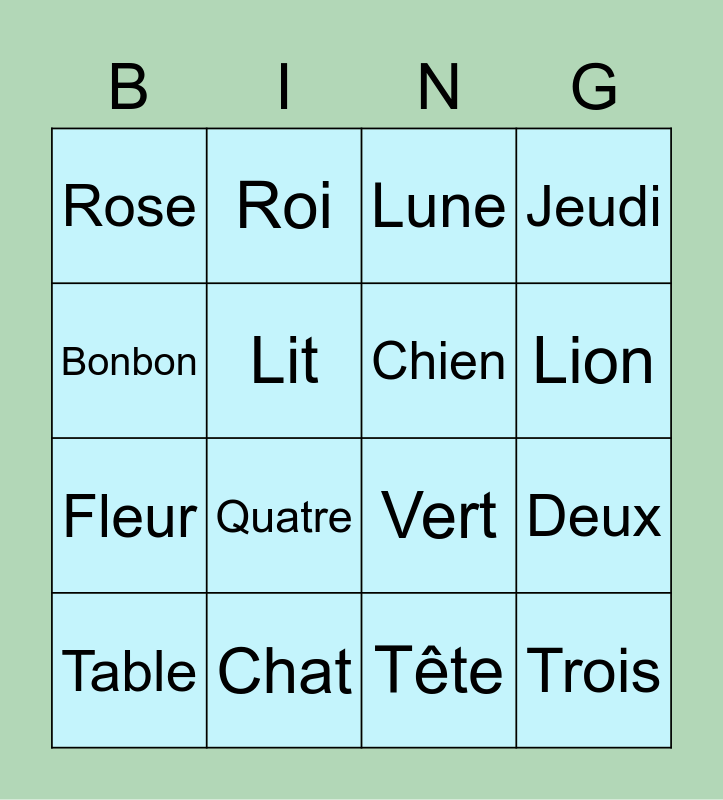 This bingo card has 20 words: Deux, Noir, Lune, Patte, Table, Bonbon, Chat, Rose, Fleur, Roi, Quatre, Vert, Lit, Trois, Chien, Bleu, Lion, Jeudi, Tête and Queue.