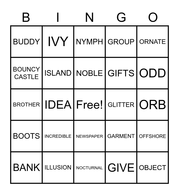 This bingo card has a free space and 74 words: BIRTHDAY, INVENTIVE, NOBLE, GAMES, OCCASION, BUGLE, INVITATIONS, NOVEMBER, GATHERING, OFFER, BANK, INTERESTING, GIFTS, ORNATE, BEACH, ILLUSION, NOTEBOOK, GLITTER, ONION, BUDDY, IDEA, NYMPH, GROUP, ORB, BOUNCY CASTLE, INSANE, NOOK, GRANDPA, OUTDOORS, BANNERS, ISLAND, NORTH, GRIN, OPPORTUNITY, BASEBALL, IMPRESSIVE, NINETEEN, GUM, OBJECT, BACON, INVOLVED, NEWSPAPER, GANG, OFFICIAL, BEADS, IVY, NEVADA, GAGGLE, ONYX, BALLROOM, IGLOO, NECKLACE, GARMENT, OBSERVE, BEST, INJUSTICE, NOCTURNAL, GRANDMA, OCELOT, BOOTS, INCREDIBLE, NOTICE, GIVE, OFFSHORE, BROTHER, IMPOSSIBLE, NIBBLE, GHOST, ODD, BRILIANT, ICONIC, NEAT, GLORY and ORANGE.