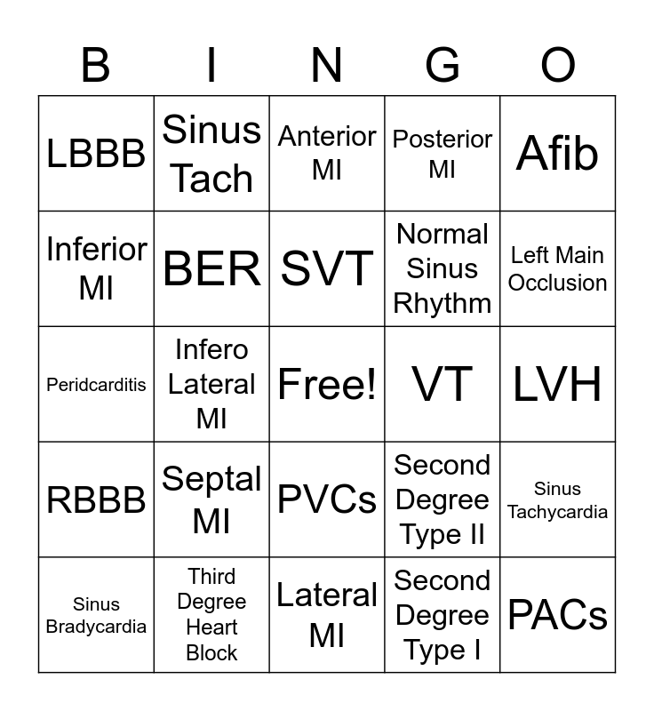 This bingo card has a free space and 24 words: Septal MI, Third Degree Heart Block, SVT, Sinus Bradycardia, Afib, LBBB, Inferior MI, Sinus Tach, VT, PVCs, Normal Sinus Rhythm, Peridcarditis, Second Degree Type II, Sinus Tachycardia, BER, Second Degree Type I, LVH, Anterior MI, Left Main Occlusion, Infero Lateral MI, PACs, RBBB, Posterior MI and Lateral MI.