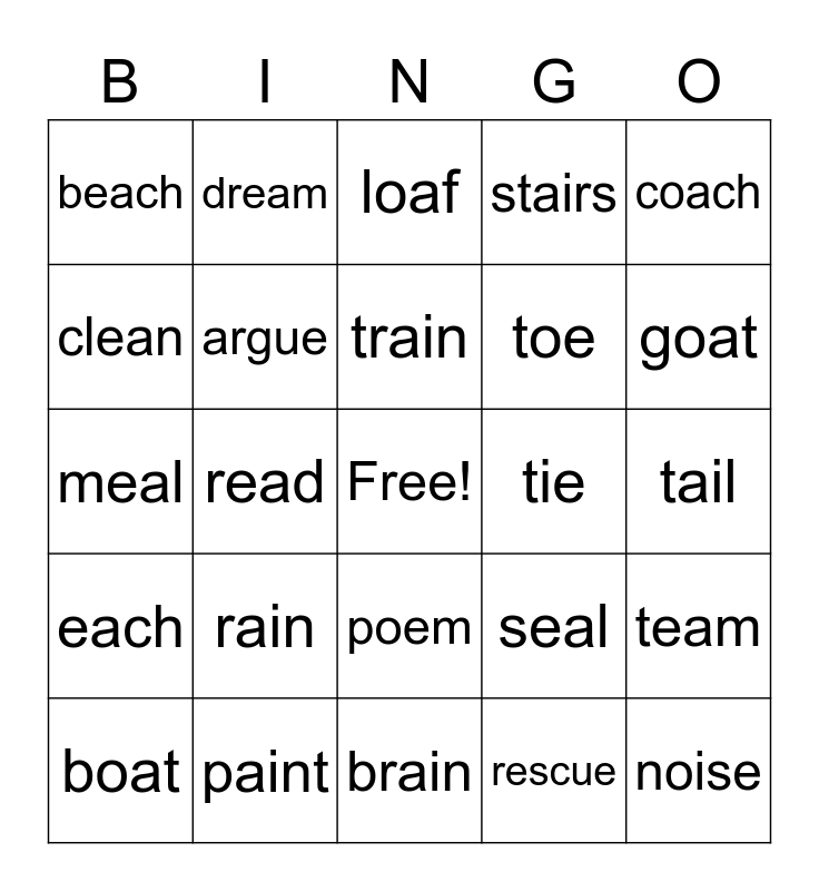 This bingo card has a free space and 24 words: rain, paint, train, boat, coach, beach, clean, dream, tie, poem, toe, meal, seal, team, argue, rescue, tail, loaf, goat, read, noise, each, stairs and brain.