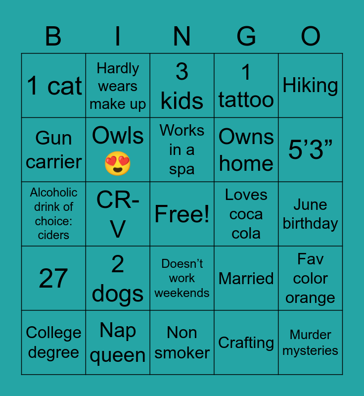 This bingo card has a free space and 24 words: 2 dogs, Nap queen, Works in a spa, College degree, Hiking, 1 cat, Gun carrier, Hardly wears make up, Loves coca cola, Doesn’t work weekends, Owns home, Alcoholic drink of choice: ciders, Married, Fav color orange, Owls 😍, Crafting, June birthday, 3 kids, 5’3”, CR-V, Murder mysteries, 27, 1 tattoo and Non smoker.