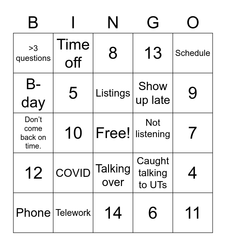 This bingo card has a free space and 24 words: COVID, Telework, Listings, Phone, Schedule, >3 questions, B-day, Time off, Not listening, Talking over, Show up late, Don’t come back on time., Caught talking to UTs, 4, 5, 6, 7, 8, 9, 10, 11, 12, 13 and 14.