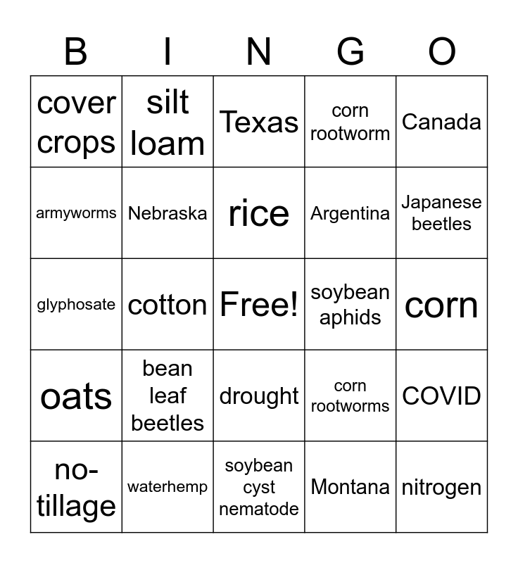 This bingo card has a free space and 70 words: Colorado, corn, soybean, dicamba, waterhemp, Iowa State University, corn rootworm, herbicide resistance, Canada, canola, COVID, reduced tillage, cover crops, Texas, sorghum, cotton, drought, Argentina, Germany, oats, soybean aphids, corn rootworms, Japanese beetles, alfalfa, soybean gall midge, frogeye leaf spot, fungicide, insecticide, Montana, loam, silt loam, Minnesota, Iowa, Illinois, rainfall, Mollisol, Alfisol, lambsquarter, velvetleaf, armyworms, Indiana, bean leaf beetles, nitrogen, phosphorus, potassium, Nebraska, no-tillage, sudden death syndrome, irrigation, rainfed, water quality, soil health, Maryland, Florida, soybean cyst nematode, Arkansas, rice, wheat, New York, organic, glyphosate, Michigan, California, white mold, common rust, almonds, orchard, vineyard, grey leaf spot and Wisconsin.