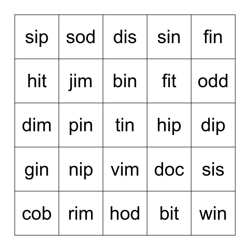 This bingo card has a free space and 40 words: nil, dim, him, jim, rim, vim, bin, din, fin, gin, pin, sin, win, dip, hip, nip, rip, sip, tip, dis, sis, bit, fit, hit, lit, mit, nit, pit, sit, wit, bob, cob, lob, doc, odd, hod, pod, rod, sod and doe.