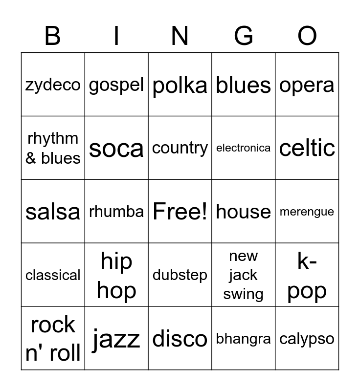 This bingo card has a free space and 24 words: hip hop, jazz, country, rock n' roll, opera, zydeco, rhythm & blues, gospel, house, dubstep, electronica, salsa, new jack swing, k-pop, soca, bhangra, merengue, polka, celtic, rhumba, calypso, classical, blues and disco.