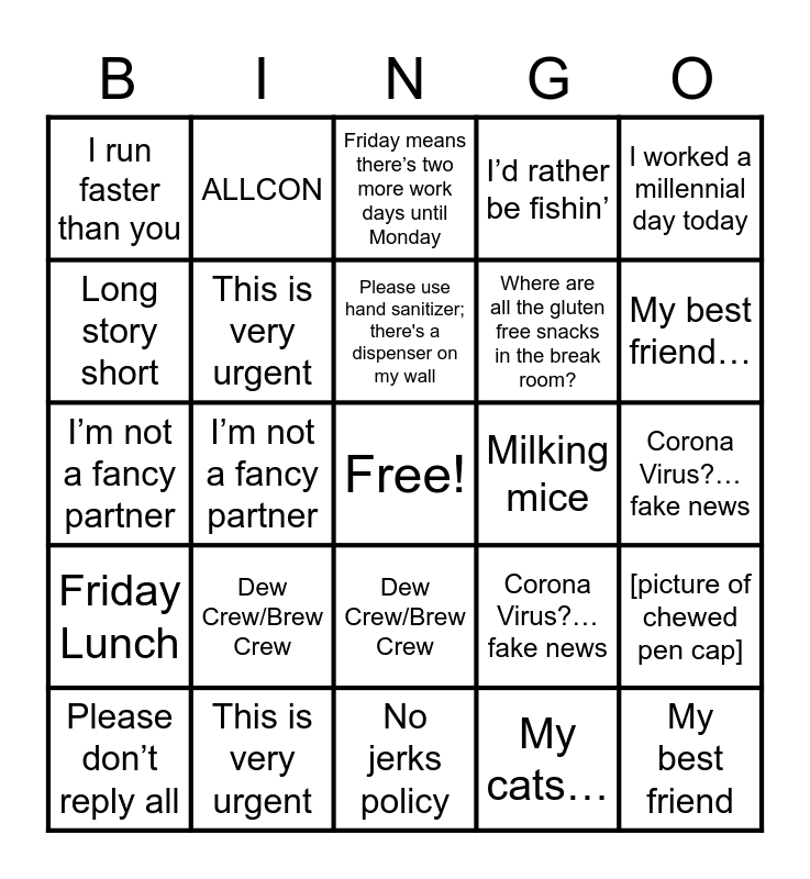 This bingo card has a free space and 48 words: Gentle Readers, My best friend, Please don’t reply all, No jerks policy, Dew Crew/Brew Crew, Friday Lunch, ALLCON, The juice isn't worth the squeeze, Long story short, January 1: “So about bonuses this year…”, This is very urgent, I’d rather be fishin’, [picture of chewed pen cap], Corona Virus?…fake news, This isn’t my first rodeo, It needs to be simple, simple, simple, Please use hand sanitizer; there's a dispenser on my wall, Milking mice, Friday means there’s two more work days until Monday, I worked a millennial day today, I’m not a fancy partner, My cats…, I run faster than you, Where are all the gluten free snacks in the break room?, Gentle Readers, My best friend…, Please don’t reply all, No jerks policy, Dew Crew/Brew Crew, Friday Lunch, ALLCON, The juice isn't worth the squeeze, Long story short, January 1: “So about bonuses this year…”, This is very urgent, I’d rather be fishin’, [picture of chewed pen cap], Corona Virus?…fake news, This isn’t my first rodeo, It needs to be simple, simple, simple, Please use hand sanitizer; there's a dispenser on my wall, Milking mice, Friday means there’s two more work days until Monday, I worked a millennial day today, I’m not a fancy partner, My cats…, I run faster than you and Where are all the gluten free snacks in the break room?.