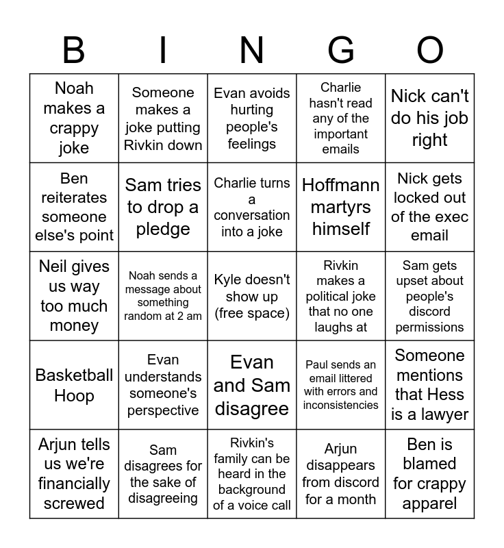 This bingo card has a free space and 24 words: Evan understands someone's perspective, Sam disagrees for the sake of disagreeing, Charlie turns a conversation into a joke, Arjun tells us we're financially screwed, Nick can't do his job right, Noah makes a crappy joke, Ben reiterates someone else's point, Someone makes a joke putting Rivkin down, Rivkin makes a political joke that no one laughs at, Evan and Sam disagree, Hoffmann martyrs himself, Neil gives us way too much money, Paul sends an email littered with errors and inconsistencies, Someone mentions that Hess is a lawyer, Sam tries to drop a pledge, Arjun disappears from discord for a month, Sam gets upset about people's discord permissions, Evan avoids hurting people's feelings, Nick gets locked out of the exec email, Noah sends a message about something random at 2 am, Ben is blamed for crappy apparel, Basketball Hoop, Charlie hasn't read any of the important emails and Rivkin's family can be heard in the background of a voice call.