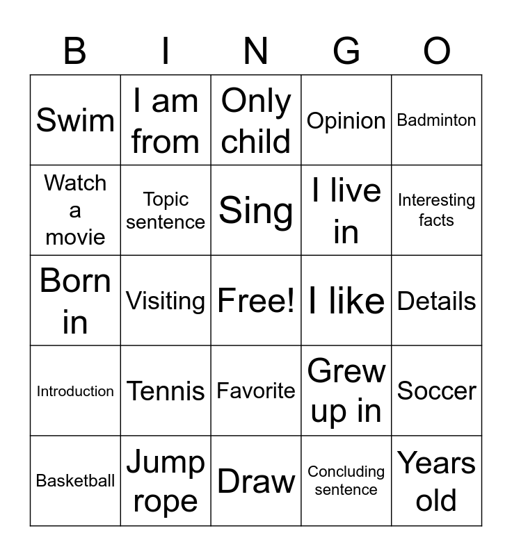 This bingo card has a free space and 24 words: Tennis, Jump rope, Sing, Basketball, Badminton, Swim, Watch a movie, I am from, I like, Favorite, I live in, Born in, Grew up in, Soccer, Topic sentence, Concluding sentence, Details, Only child, Interesting facts, Visiting, Years old, Introduction, Opinion and Draw.