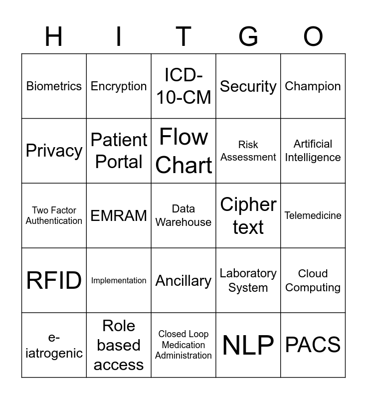 This bingo card has a free space and 31 words: Closed Loop Medication Administration, Pharmacy System, EMRAM, Computerized Decision Support, Biometrics, ICD-10-CM, Patient Portal, Laboratory System, Cipher text, NLP, Telemedicine, PACS, Watson, RTLS, Artificial Intelligence, Health Information Exchange, Cloud Computing, Implementation, RFID, Ancillary, Champion, Unstructured, e-iatrogenic, Encryption, Risk Assessment, Privacy, Security, Two Factor Authentication, Role based access, Flow Chart and Wireframe.