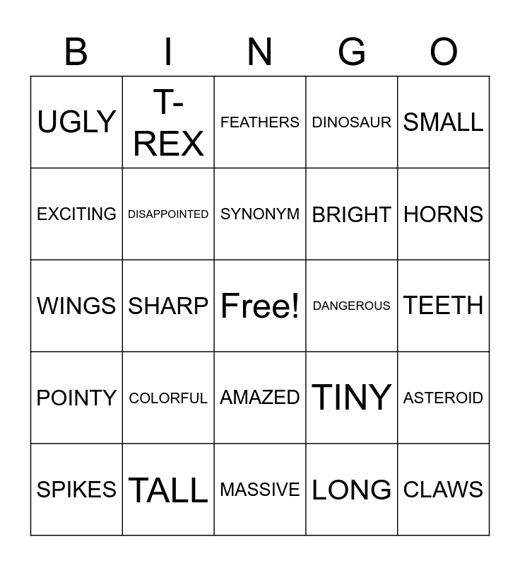 This bingo card has a free space and 29 words: SPIKES, FRIGHTENING, SHARP, FASCINATING, UGLY, FEATHERS, DISAPPOINTED, COLORFUL, DANGEROUS, TALL, TEETH, CLAWS, MASSIVE, LONG, HORNS, BEAK, AMAZED, POINTY, SMALL, WINGS, TINY, BORED, BRIGHT, EXCITING, DINOSAUR, T-REX, ASTEROID, SYNONYM and ADJECTIVE.