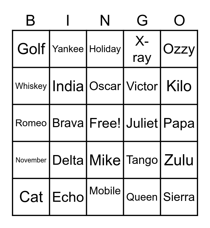 This bingo card has a free space and 29 words: Cat, Alpha, Brava, Fox, Golf, Holiday, India, Delta, Juliet, Echo, Papa, Sierra, Mobile, Queen, Kilo, Lima, Mike, November, Ozzy, Romeo, Tango, Unicorn, Victor, Whiskey, X-ray, Yankee, Zulu, Oscar and Indigo.