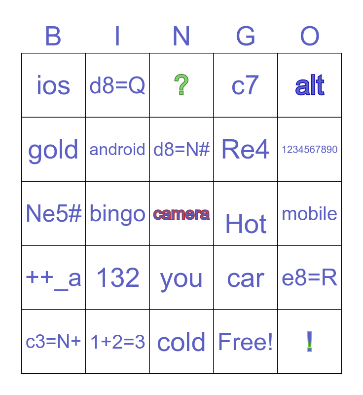 This bingo card has 30 words: 1+2=3, yummy, bingo, name, ios, ?, android, you, Hot, cold, mobile, camera, Free!, !, 1234567890, apple, car, ++_a, 132, alt, Ne5#, Be8+, d8=Q, Re4, gold, c7, e8=R, c3=N+, d8=N# and BomBom1999.