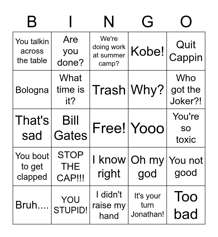This bingo card has a free space and 24 words: STOP THE CAP!!!, YOU STUPID!, Trash, Bruh...., Quit Cappin, You talkin across the table, Bologna, Are you done?, Yooo, I know right, Why?, That's sad, Oh my god, You not good, What time is it?, It's your turn Jonathan!, You're so toxic, We're doing work at summer camp?, Who got the Joker?!, Bill Gates, Too bad, You bout to get clapped, Kobe! and I didn't raise my hand.