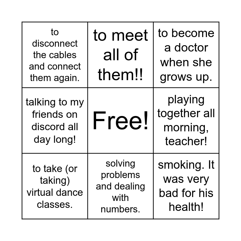 This bingo card has a free space and 16 words: to travel to Paris as a birthday gift!, to put one more jacket on., to become a doctor when she grows up., to disconnect the cables and connect them again., to play his favourite songs!, to meet all of them!!, painting and designing new pieces!, writing his Portuguese essay., smoking. It was very bad for his health!, playing together all morning, teacher!, learning Spanish!, talking to my friends on discord all day long!, eating desserts like petit gateau, brownies..., solving problems and dealing with numbers., to take (or taking) virtual dance classes. and watching (or to watch), I can't stop!!.