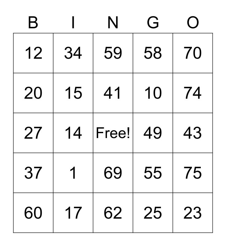 This bingo card has a free space and 24 words: 1, 17, 41, 60, 70, 12, 20, 34, 49, 69, 10, 27, 55, 75, 15, 25, 43, 59, 74, 14, 23, 37, 58 and 62.