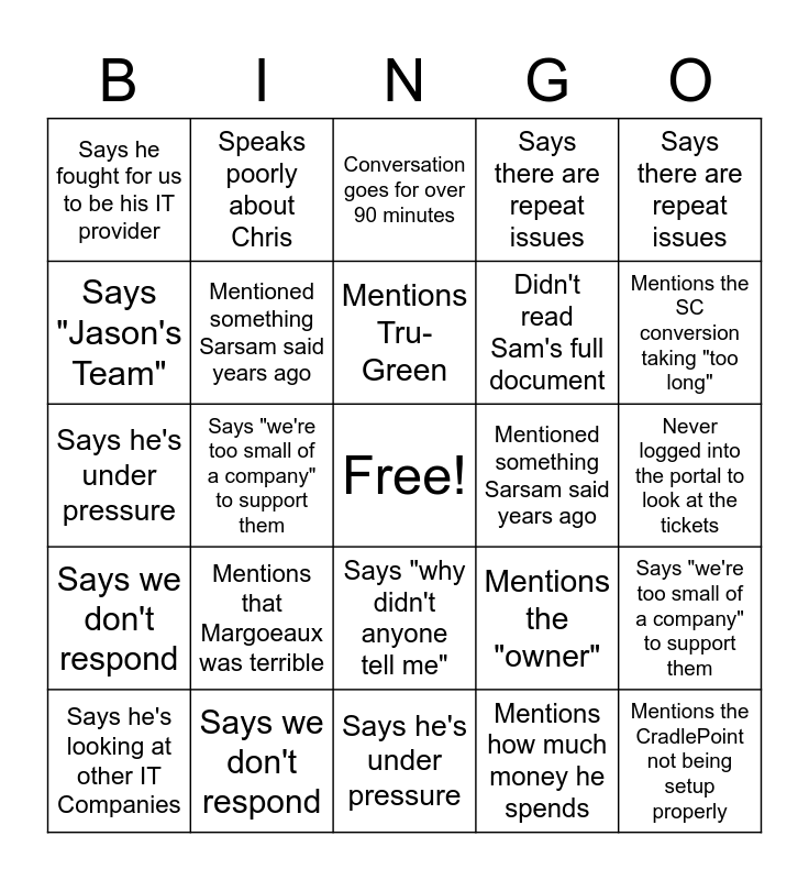 This bingo card has a free space and 24 words: Mentions that Margoeaux was terrible, Says we don't respond, Mentions Tru-Green, Says he's looking at other IT Companies, Says there are repeat issues, Says he fought for us to be his IT provider, Says "Jason's Team", Speaks poorly about Chris, Mentioned something Sarsam said years ago, Says "why didn't anyone tell me", Didn't read Sam's full document, Says he's under pressure, Mentions the "owner", Says "we're too small of a company" to support them, Mentioned something Sarsam said years ago, Mentions how much money he spends, Never logged into the portal to look at the tickets, Conversation goes for over 90 minutes, Mentions the SC conversion taking "too long", Says "we're too small of a company" to support them, Mentions the CradlePoint not being setup properly, Says we don't respond, Says there are repeat issues and Says he's under pressure.
