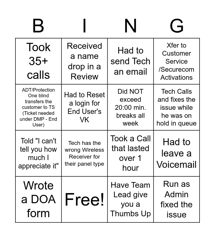 This bingo card has 16 words: Free!, Had to leave a Voicemail, Had to send Tech an email, Took 35+ calls, Told "I can't tell you how much I appreciate it", Received a name drop in a Review, Took a Call that lasted over 1 hour, Have Team Lead give you a Thumbs Up, ADT/Protection One blind transfers the customer to TS (Ticket needed under DMP - End User), Had to Reset a login for End User's VK, Wrote a DOA form, Xfer to Customer Service /Securecom Activations, Tech has the wrong Wireless Receiver for their panel type, Tech Calls and fixes the issue while he was on hold in queue, Did NOT exceed 20:00 min. breaks all week and Run as Admin fixed the issue.