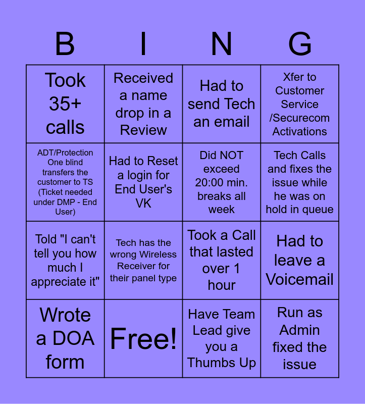 This bingo card has 16 words: Free!, Had to leave a Voicemail, Had to send Tech an email, Took 35+ calls, Told "I can't tell you how much I appreciate it", Received a name drop in a Review, Took a Call that lasted over 1 hour, Have Team Lead give you a Thumbs Up, ADT/Protection One blind transfers the customer to TS (Ticket needed under DMP - End User), Had to Reset a login for End User's VK, Wrote a DOA form, Xfer to Customer Service /Securecom Activations, Tech has the wrong Wireless Receiver for their panel type, Tech Calls and fixes the issue while he was on hold in queue, Did NOT exceed 20:00 min. breaks all week and Run as Admin fixed the issue.