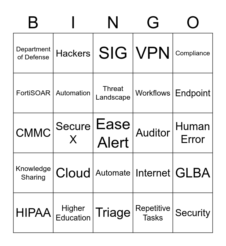 This bingo card has a free space and 26 words: Automate, Repetitive Tasks, Threat Landscape, Higher Education, Compliance, Department of Defense, FortiSOAR, Hackers, Human Error, Internet, Workflows, CMMC, GLBA, HIPAA, Secure X, Role Based Access Control, VPN, Knowledge Sharing, SIG, Security, Endpoint, Triage, Auditor, Cloud, Automation and Network.