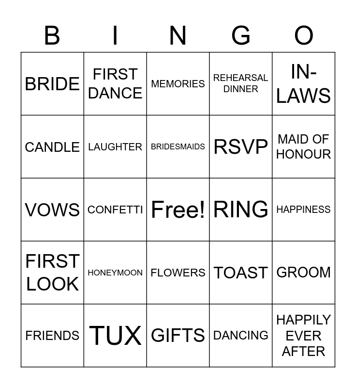 This bingo card has a free space and 24 words: HONEYMOON, TUX, BRIDESMAIDS, FRIENDS, IN-LAWS, BRIDE, CANDLE, FIRST DANCE, RING, FLOWERS, RSVP, VOWS, TOAST, GROOM, LAUGHTER, DANCING, HAPPINESS, MEMORIES, MAID OF HONOUR, CONFETTI, HAPPILY EVER AFTER, FIRST LOOK, REHEARSAL DINNER and GIFTS.