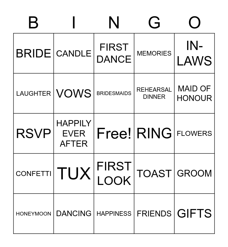 This bingo card has a free space and 24 words: HONEYMOON, TUX, BRIDESMAIDS, FRIENDS, IN-LAWS, BRIDE, CANDLE, FIRST DANCE, RING, FLOWERS, RSVP, VOWS, TOAST, GROOM, LAUGHTER, DANCING, HAPPINESS, MEMORIES, MAID OF HONOUR, CONFETTI, HAPPILY EVER AFTER, FIRST LOOK, REHEARSAL DINNER and GIFTS.
