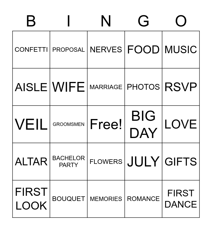 This bingo card has a free space and 24 words: BACHELOR PARTY, BOUQUET, MARRIAGE, FIRST LOOK, MUSIC, CONFETTI, AISLE, PROPOSAL, BIG DAY, FLOWERS, PHOTOS, VEIL, JULY, GIFTS, WIFE, ROMANCE, LOVE, NERVES, RSVP, GROOMSMEN, FIRST DANCE, ALTAR, FOOD and MEMORIES.