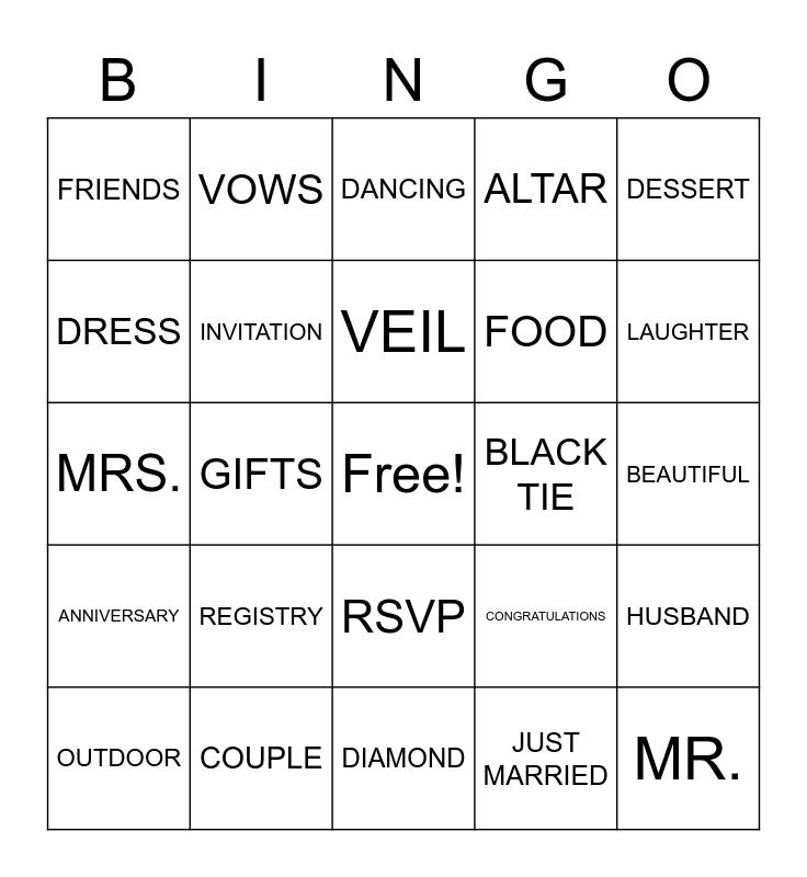 This bingo card has a free space and 24 words: OUTDOOR, REGISTRY, VEIL, JUST MARRIED, DESSERT, FRIENDS, VOWS, DANCING, BLACK TIE, BEAUTIFUL, MRS., INVITATION, CONGRATULATIONS, HUSBAND, DRESS, COUPLE, DIAMOND, ALTAR, LAUGHTER, ANNIVERSARY, GIFTS, RSVP, FOOD and MR..