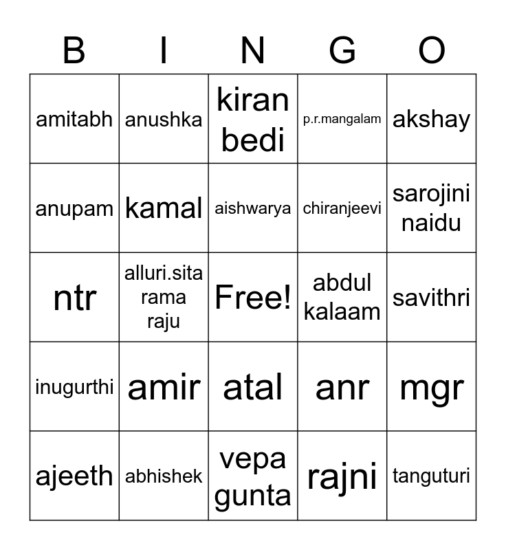 This bingo card has a free space and 24 words: amir, abhishek, aishwarya, ajeeth, akshay, amitabh, anupam, anushka, abdul kalaam, atal, chiranjeevi, ntr, anr, mgr, kamal, rajni, savithri, kiran bedi, sarojini naidu, alluri.sita rama raju, tanguturi, inugurthi, p.r.mangalam and vepa gunta.