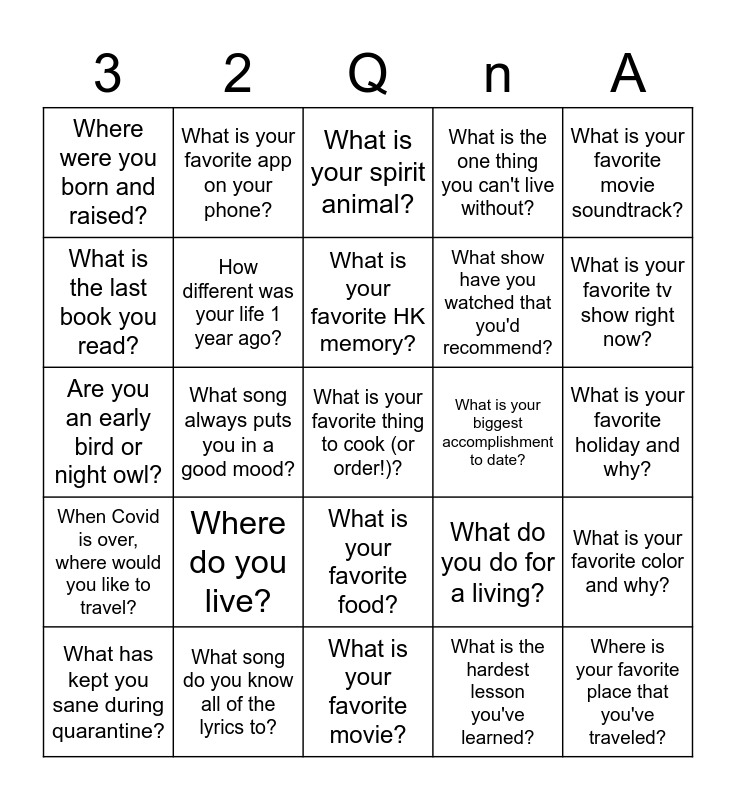 This bingo card has 25 words: Where do you live?, What is your favorite movie?, What is your favorite HK memory?, What has kept you sane during quarantine?, What is your favorite movie soundtrack?, Where were you born and raised?, What is the last book you read?, What is your favorite app on your phone?, What is your biggest accomplishment to date?, What is your favorite food?, What show have you watched that you'd recommend?, Are you an early bird or night owl?, What do you do for a living?, What is your favorite color and why?, How different was your life 1 year ago?, Where is your favorite place that you've traveled?, What is your favorite holiday and why?, What is your spirit animal?, What is your favorite tv show right now?, What song always puts you in a good mood?, What is your favorite thing to cook (or order!)?, What song do you know all of the lyrics to?, When Covid is over, where would you like to travel?, What is the one thing you can't live without? and What is the hardest lesson you've learned?.