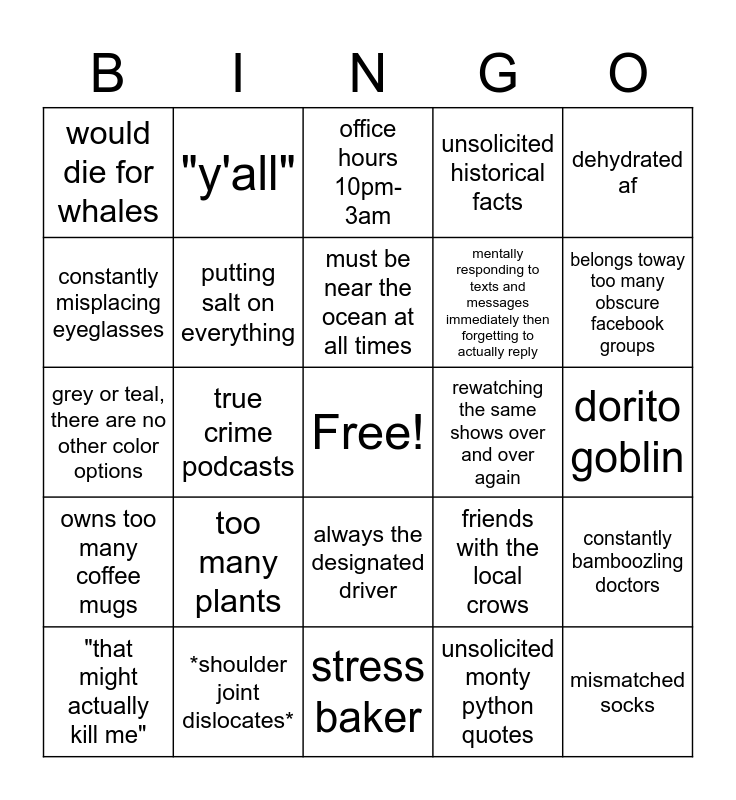 This bingo card has a free space and 24 words: too many plants, *shoulder joint dislocates*, must be near the ocean at all times, "that might actually kill me", dehydrated af, would die for whales, constantly misplacing eyeglasses, "y'all", rewatching the same shows over and over again, always the designated driver, mentally responding to texts and messages immediately then forgetting to actually reply, grey or teal, there are no other color options, friends with the local crows, constantly bamboozling doctors, putting salt on everything, unsolicited monty python quotes, dorito goblin, office hours 10pm-3am, belongs toway too many obscure facebook groups, true crime podcasts, mismatched socks, owns too many coffee mugs, unsolicited historical facts and stress baker.