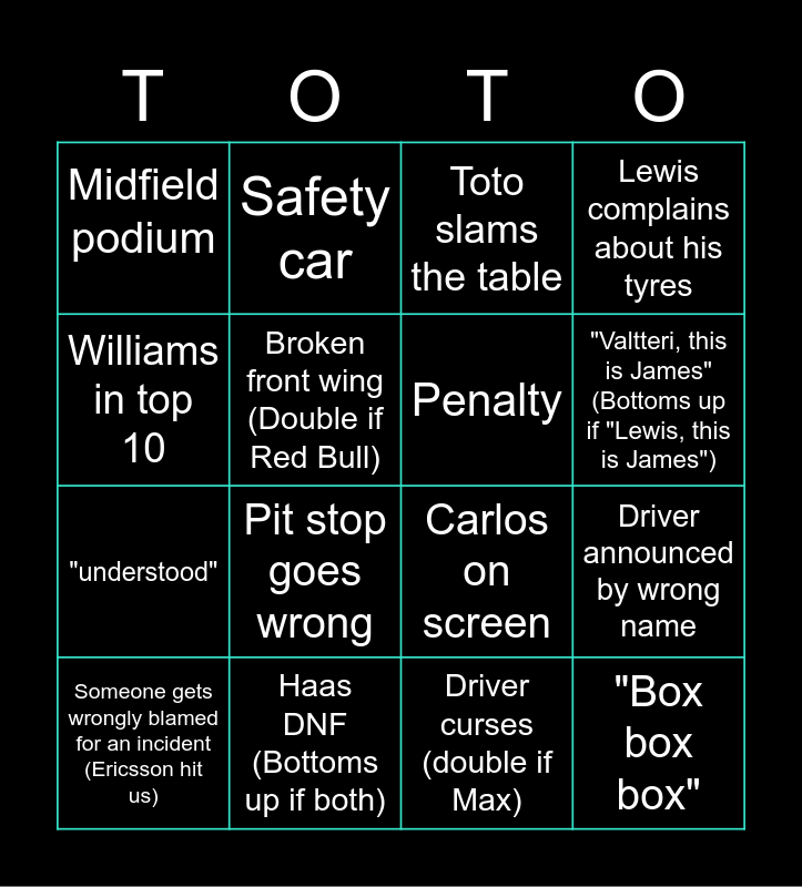 This bingo card has 16 words: Haas DNF (Bottoms up if both), Driver announced by wrong name, Toto slams the table, Midfield podium, "understood", Safety car, Carlos on screen, Driver curses (double if Max), Williams in top 10, Broken front wing (Double if Red Bull), Someone gets wrongly blamed for an incident (Ericsson hit us), Lewis complains about his tyres, Pit stop goes wrong, "Valtteri, this is James" (Bottoms up if "Lewis, this is James"), Penalty and "Box box box".
