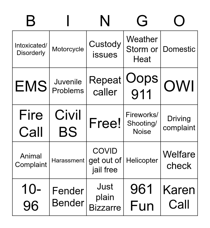 This bingo card has a free space and 24 words: Harassment, Fender Bender, Repeat caller, 10-96, Domestic, Intoxicated/ Disorderly, EMS, Motorcycle, Fireworks/ Shooting/ Noise, COVID get out of jail free, Oops 911, Fire Call, Helicopter, Welfare check, Juvenile Problems, 961 Fun, Driving complaint, Custody issues, OWI, Civil BS, Karen Call, Animal Complaint, Weather Storm or Heat and Just plain Bizzarre.