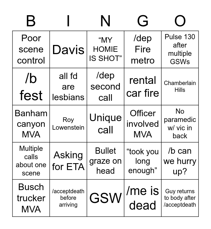 This bingo card has a free space and 24 words: Asking for ETA, /acceptdeath before arriving, /dep second call, Busch trucker MVA, Pulse 130 after multiple GSWs, Poor scene control, /b fest, Davis, Officer involved MVA, Bullet graze on head, rental car fire, Banham canyon MVA, “took you long enough”, /b can we hurry up?, all fd are lesbians, /me is dead, No paramedic w/ vic in back, “MY HOMIE IS SHOT”, Chamberlain Hills, Roy Lowenstein, Guy returns to body after /acceptdeath, Multiple calls about one scene, /dep Fire metro and GSW.