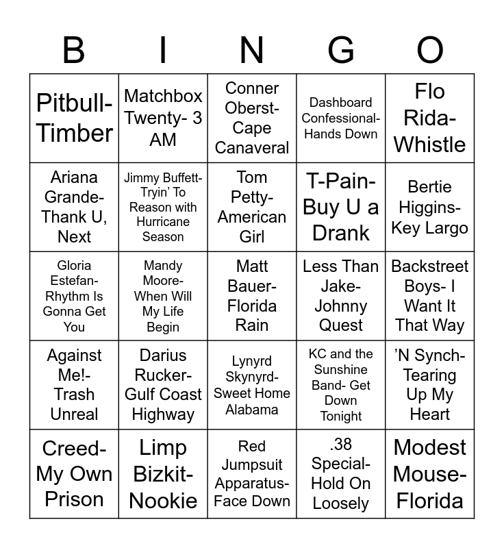 This bingo card has 26 words: Lynyrd Skynyrd- Sweet Home Alabama, .38 Special- Hold On Loosely, Tom Petty- American Girl, Limp Bizkit- Nookie, Flo Rida- Whistle, Pitbull- Timber, Ariana Grande- Thank U, Next, Matchbox Twenty- 3 AM, Backstreet Boys- I Want It That Way, KC and the Sunshine Band- Get Down Tonight, T-Pain- Buy U a Drank, Gloria Estefan- Rhythm Is Gonna Get You, ’N Synch- Tearing Up My Heart, Creed- My Own Prison, Mandy Moore- When Will My Life Begin, Yellowcard- Ocean Avenue, Dashboard Confessional- Hands Down, Against Me!- Trash Unreal, Conner Oberst- Cape Canaveral, Matt Bauer- Florida Rain, Bertie Higgins- Key Largo, Red Jumpsuit Apparatus- Face Down, Less Than Jake- Johnny Quest, Darius Rucker- Gulf Coast Highway, Jimmy Buffett- Tryin’ To Reason with Hurricane Season and Modest Mouse- Florida.