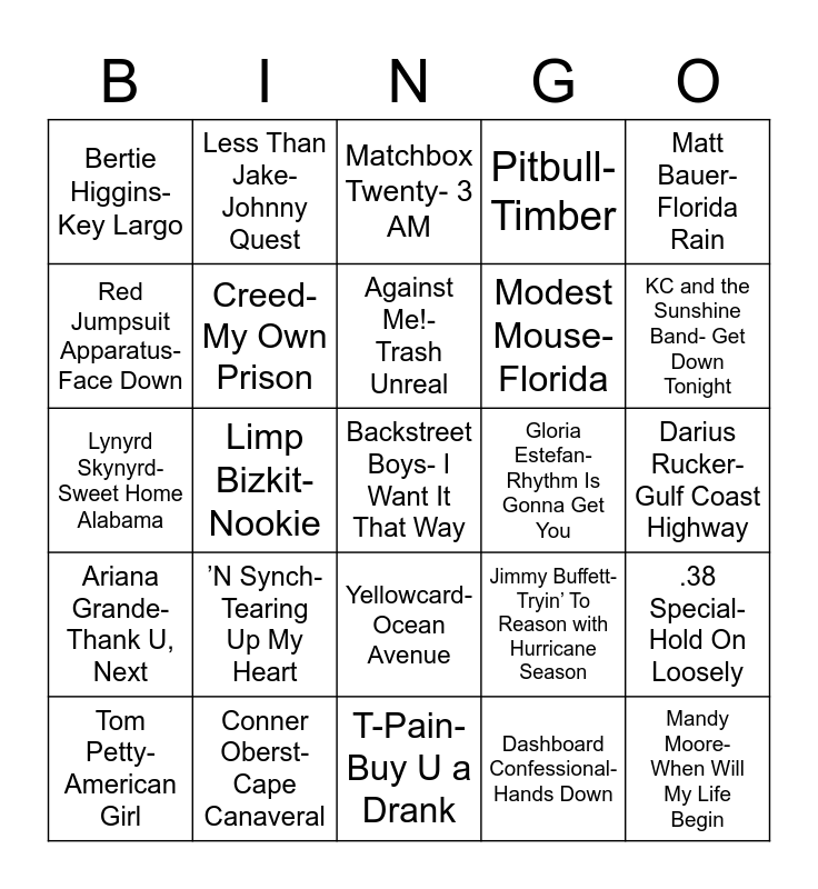 This bingo card has 26 words: Yellowcard- Ocean Avenue, Dashboard Confessional- Hands Down, Against Me!- Trash Unreal, Conner Oberst- Cape Canaveral, Matt Bauer- Florida Rain, Bertie Higgins- Key Largo, Red Jumpsuit Apparatus- Face Down, Less Than Jake- Johnny Quest, Darius Rucker- Gulf Coast Highway, Jimmy Buffett- Tryin’ To Reason with Hurricane Season, Modest Mouse- Florida, Lynyrd Skynyrd- Sweet Home Alabama, .38 Special- Hold On Loosely, Tom Petty- American Girl, Limp Bizkit- Nookie, Flo Rida- Whistle, Pitbull- Timber, Ariana Grande- Thank U, Next, Matchbox Twenty- 3 AM, Backstreet Boys- I Want It That Way, KC and the Sunshine Band- Get Down Tonight, T-Pain- Buy U a Drank, Gloria Estefan- Rhythm Is Gonna Get You, ’N Synch- Tearing Up My Heart, Creed- My Own Prison and Mandy Moore- When Will My Life Begin.