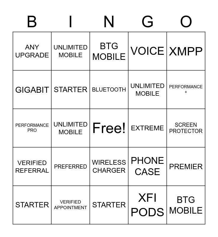 This bingo card has a free space and 24 words: PREFERRED, VERIFIED APPOINTMENT, BLUETOOTH, STARTER, XMPP, ANY UPGRADE, GIGABIT, UNLIMITED MOBILE, EXTREME, WIRELESS CHARGER, UNLIMITED MOBILE, PERFORMANCE PRO, PHONE CASE, PREMIER, STARTER, XFI PODS, SCREEN PROTECTOR, BTG MOBILE, PERFORMANCE +, UNLIMITED MOBILE, BTG MOBILE, VERIFIED REFERRAL, VOICE and STARTER.