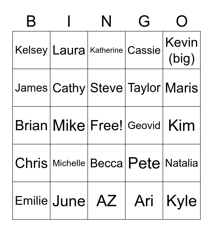 This bingo card has a free space and 33 words: Papa, Mary Ann, Mike, Alma, Chris, Cathy, Kevin (big), Emilie, Laura, Stuart, Steve, Katherine, Kevin, Sasha, Geovid, Maris, June, Brian, Michelle, Pete, Becca, Matt, Kelsey, Kim, AZ, Kyle, Cassie, Taylor, James, Natalia, Colleen, Ari and Chuck.