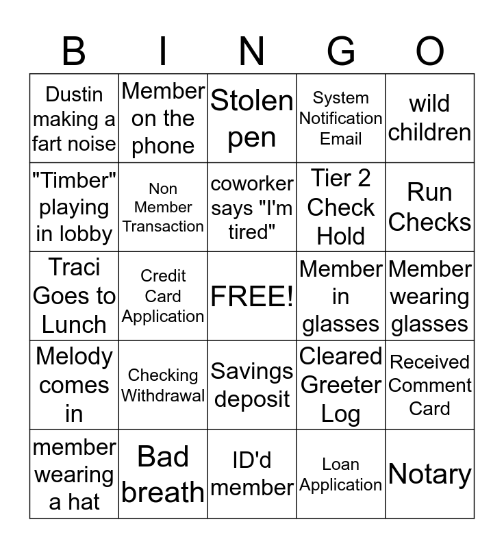 This bingo card has a free space and 24 words: Checking Withdrawal, Bad breath, coworker says "I'm tired", member wearing a hat, wild children, Dustin making a fart noise, "Timber" playing in lobby, Member on the phone, Member in glasses, Savings deposit, Tier 2 Check Hold, Traci Goes to Lunch, Cleared Greeter Log, Received Comment Card, Non Member Transaction, Loan Application, Member wearing glasses, Stolen pen, Run Checks, Credit Card Application, Notary, Melody comes in, System Notification Email and ID'd member.