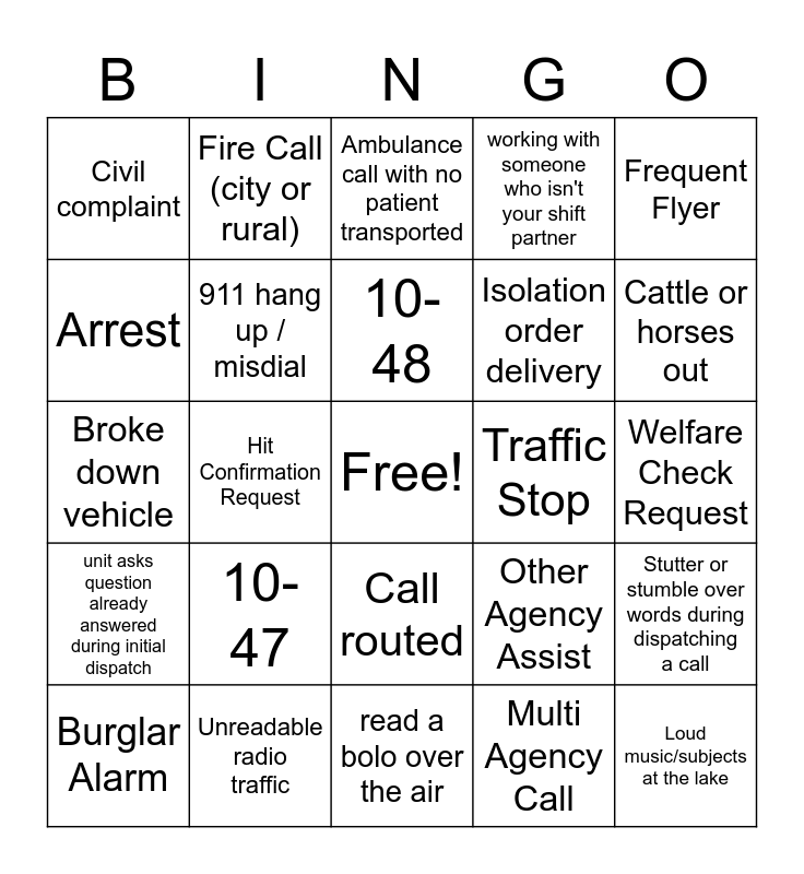 This bingo card has a free space and 24 words: 10-47, Unreadable radio traffic, 10-48, Burglar Alarm, Frequent Flyer, Civil complaint, Arrest, Fire Call (city or rural), Traffic Stop, Call routed, Isolation order delivery, Broke down vehicle, Other Agency Assist, Stutter or stumble over words during dispatching a call, 911 hang up / misdial, Multi Agency Call, Welfare Check Request, Ambulance call with no patient transported, Cattle or horses out, Hit Confirmation Request, Loud music/subjects at the lake, unit asks question already answered during initial dispatch, working with someone who isn't your shift partner and read a bolo over the air.