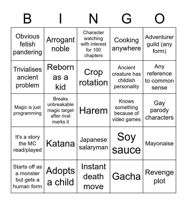 This bingo card has a free space and 48 words: Buys slaves instantly, Revenge plot, Uninteresting skill is actually OP, Instant death move, Katana, Gun, Arrogant noble, Animal eared slave girl with incurable disease (cured), Trivialises ancient problem, Demihuman racism for retarded reasons, Reborn as a kid, Cooking anywhere, Mayonaise, Soy sauce, Miso, Monster has sexy girl form, Crop rotation, Knows something because of video games, MC breaks the magical measuring device, Adventurer guild (any form), Breaks unbreakable magic target after rival marks it, Gacha, Obvious fetish pandering, Ancient creature has childish personality, Hazing by mooks, Any reference to common sense, Starts off as a monster but gets a human form, Stupid premise, Japanese salaryman, It's a story the MC read/played, Pocket dimension, Any physics explanation, Elves, Magical video games, Adopts a child, Rival character falls in love, becomes pointless, Maxed out luck, Gay parody characters, Other world school setting, Summoned with class, BOLITICS, Author gives up on an arc, conclusion trivialised, Character watching with interest for 100 chapters, Cancelled., Magic is just programming, Skill bloat, Enforced superior japanese morals and No moral problem with slavery.