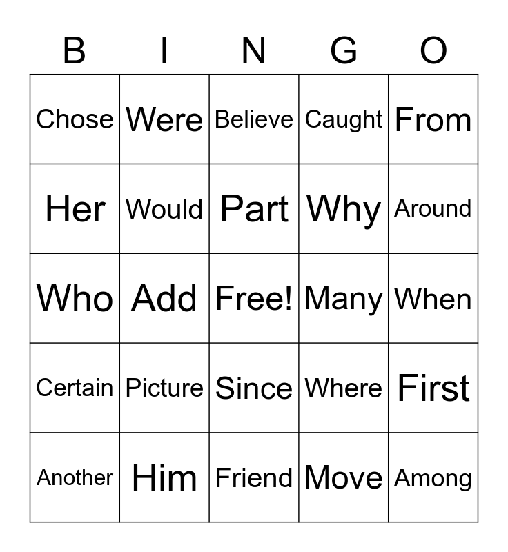 This bingo card has a free space and 26 words: Since, Move, Part, Him, From, Chose, Her, Were, When, Where, Why, Who, First, Another, Add, Change, Caught, Certain, Believe, Among, Around, Friend, Many, Picture, Would and Only.