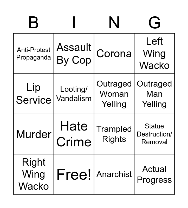 This bingo card has 16 words: Free!, Statue Destruction/ Removal, Corona, Anti-Protest Propaganda, Murder, Assault By Cop, Trampled Rights, Anarchist, Lip Service, Looting/ Vandalism, Right Wing Wacko, Left Wing Wacko, Hate Crime, Outraged Man Yelling, Outraged Woman Yelling and Actual Progress.