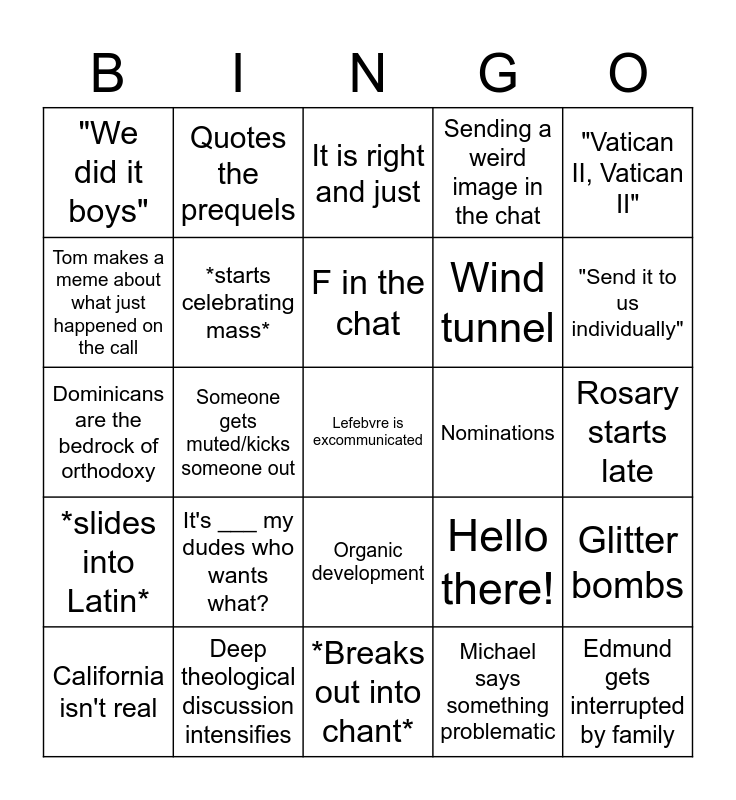 This bingo card has 25 words: It's ___ my dudes who wants what?, *Breaks out into chant*, F in the chat, California isn't real, "Vatican II, Vatican II", "We did it boys", Tom makes a meme about what just happened on the call, Quotes the prequels, Nominations, Organic development, Wind tunnel, Dominicans are the bedrock of orthodoxy, Hello there!, Glitter bombs, *starts celebrating mass*, Edmund gets interrupted by family, Rosary starts late, It is right and just, "Send it to us individually", Someone gets muted/kicks someone out, Lefebvre is excommunicated, Deep theological discussion intensifies, *slides into Latin*, Sending a weird image in the chat and Michael says something problematic.
