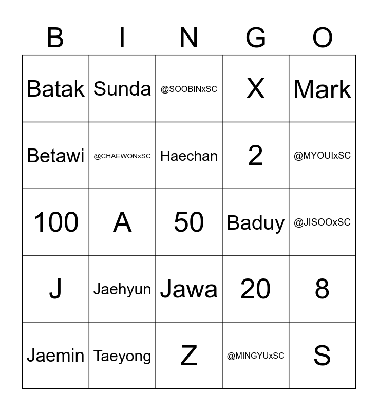 This bingo card has a free space and 24 words: Jaehyun, Taeyong, Haechan, Jaemin, Mark, Batak, Betawi, Sunda, Baduy, Jawa, 2, 100, 20, 8, @CHAEWONxSC, @MINGYUxSC, @JISOOxSC, @SOOBINxSC, @MYOUIxSC, A, S, J, X and Z.