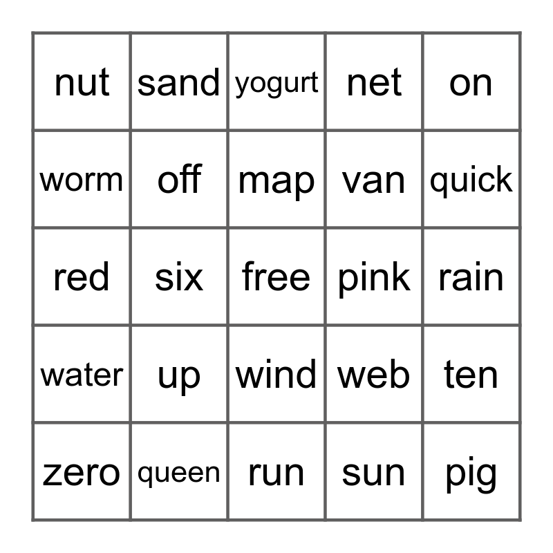 This bingo card has a free space and 24 words: up, queen, map, zero, on, nut, worm, sand, pink, wind, van, red, web, ten, off, sun, rain, yogurt, quick, six, pig, water, net and run.