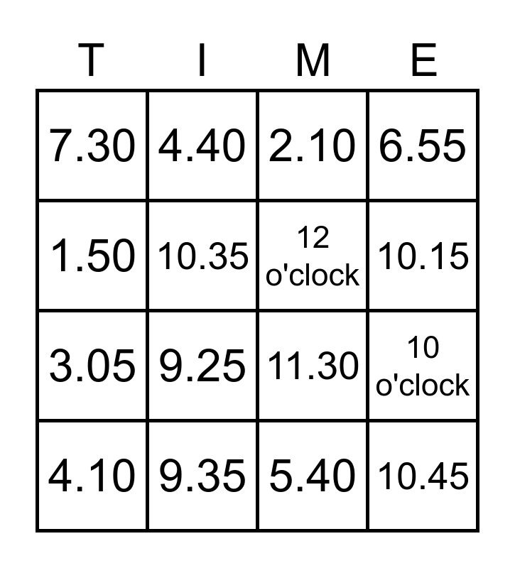 This bingo card has 16 words: 9.35, 10 o'clock, 2.10, 7.30, 3.05, 4.40, 11.30, 5.40, 1.50, 10.35, 4.10, 6.55, 9.25, 10.15, 12 o'clock and 10.45.