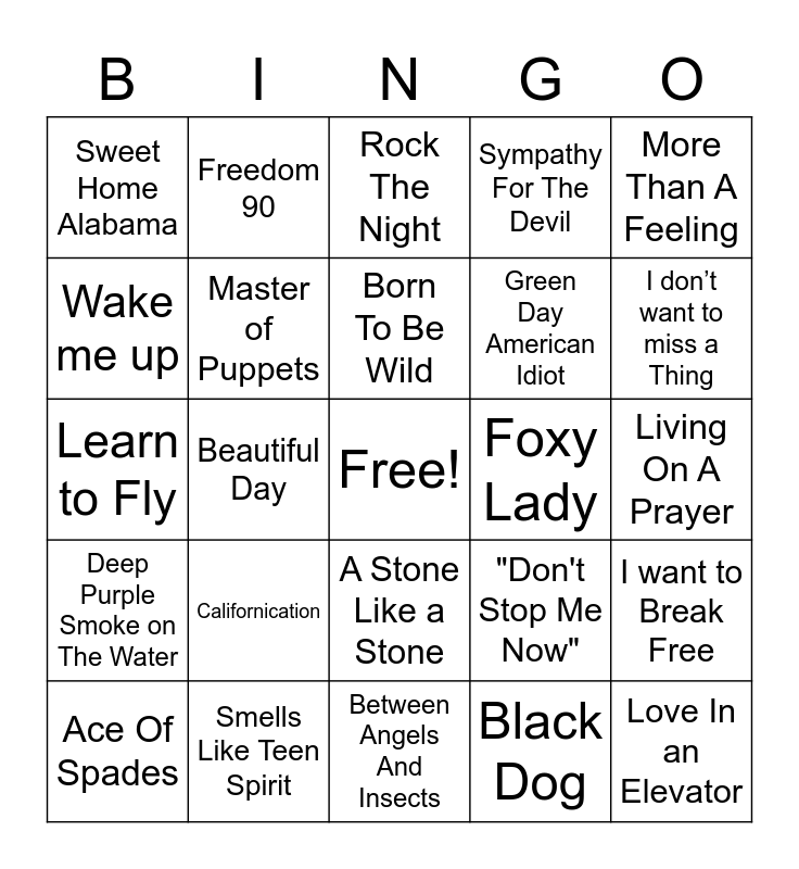 This bingo card has a free space and 58 words: Sweet Child O' Mine, Smells Like Teen Spirit, Thunderstruck, Deep Purple Smoke on The Water, Black Dog, Paranoid, Master of Puppets, Rock You Like A Hurricane, Green Day American Idiot, Run to the Hills, Sympathy For The Devil, Under the Bridge, Stone Cold Crazy, Jump, System Of A Down Chop Suey, Sweet Home Alabama, Love In an Elevator, More Than A Feeling, My Generation, Born To Be Wild, Foxy Lady, Rock The Night, Ace Of Spades, I want to Break Free, The Show Must Go, Living On A Prayer, Wonderwall, November Rain, I don’t want to miss a Thing, Zombie, The Final Countdown, Basket Case, Yellow, Cryin', Welcome To the Jungle, Alive, Bitter Sweet Symphony, Beautiful Day, Learn to Fly, Come as You Are, Californication, Summer Of '69,, "Don't Stop Me Now", Panama, System Of A Down Toxicity, Come Out To Play, Mr. Jones, A Stone Like a Stone, Between Angels And Insects, Freak On a LeaSH, Gorillaz, Incubus Drive, Closing Time, "Iris", Freedom 90, Knocking on heaven's door, Wake me up and It's my life.