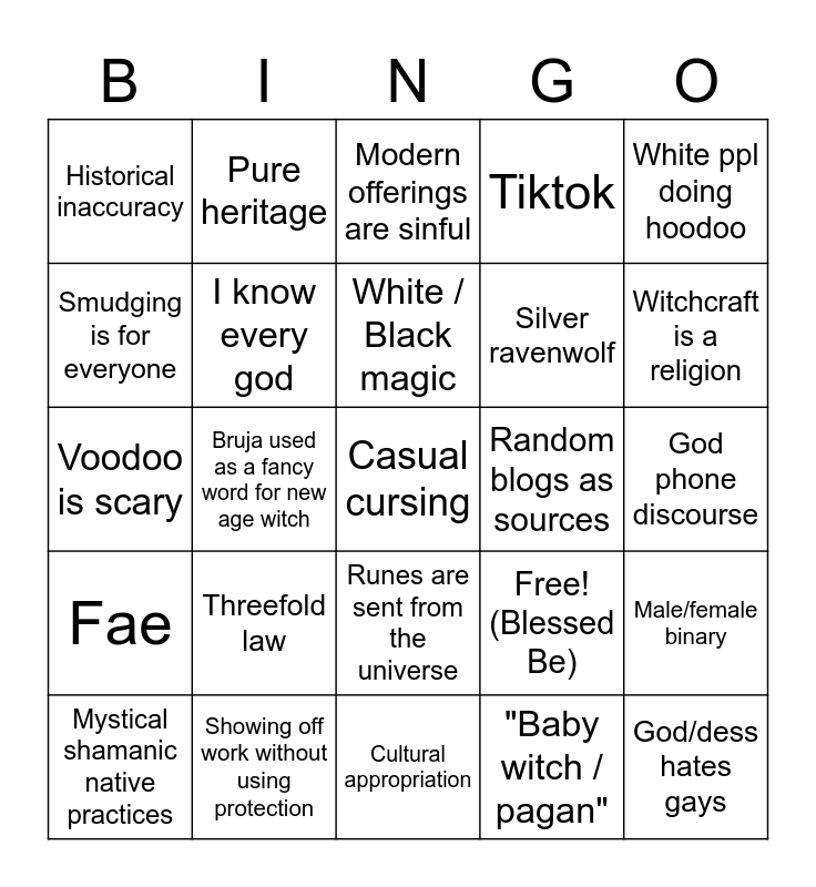 This bingo card has 25 words: Threefold law, Cultural appropriation, White / Black magic, Mystical shamanic native practices, White ppl doing hoodoo, Historical inaccuracy, Smudging is for everyone, Pure heritage, Random blogs as sources, Runes are sent from the universe, Silver ravenwolf, Voodoo is scary, Free! (Blessed Be), Male/female binary, I know every god, God/dess hates gays, God phone discourse, Modern offerings are sinful, Witchcraft is a religion, Bruja used as a fancy word for new age witch, Casual cursing, Showing off work without using protection, Fae, Tiktok and "Baby witch / pagan".