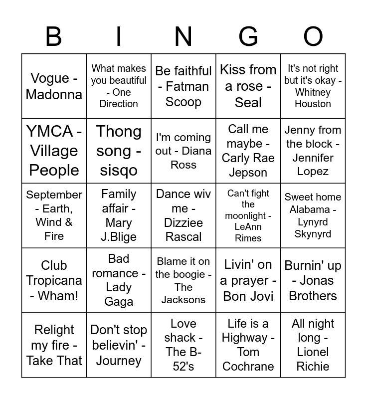 This bingo card has 25 words: Bad romance - Lady Gaga, Love shack - The B-52's, I'm coming out - Diana Ross, Relight my fire - Take That, It's not right but it's okay - Whitney Houston, Vogue - Madonna, YMCA - Village People, What makes you beautiful - One Direction, Can't fight the moonlight - LeAnn Rimes, Blame it on the boogie - The Jacksons, Call me maybe - Carly Rae Jepson, September - Earth, Wind & Fire, Livin' on a prayer - Bon Jovi, Burnin' up - Jonas Brothers, Thong song - sisqo, All night long - Lionel Richie, Sweet home Alabama - Lynyrd Skynyrd, Be faithful - Fatman Scoop, Jenny from the block - Jennifer Lopez, Family affair - Mary J.Blige, Dance wiv me - Dizziee Rascal, Don't stop believin' - Journey, Club Tropicana - Wham!, Kiss from a rose - Seal and Life is a Highway - Tom Cochrane.