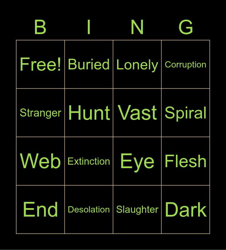 This bingo card has 16 words: End, Desolation, Lonely, Corruption, Stranger, Buried, Eye, Flesh, Free!, Hunt, Slaughter, Spiral, Web, Extinction, Vast and Dark.